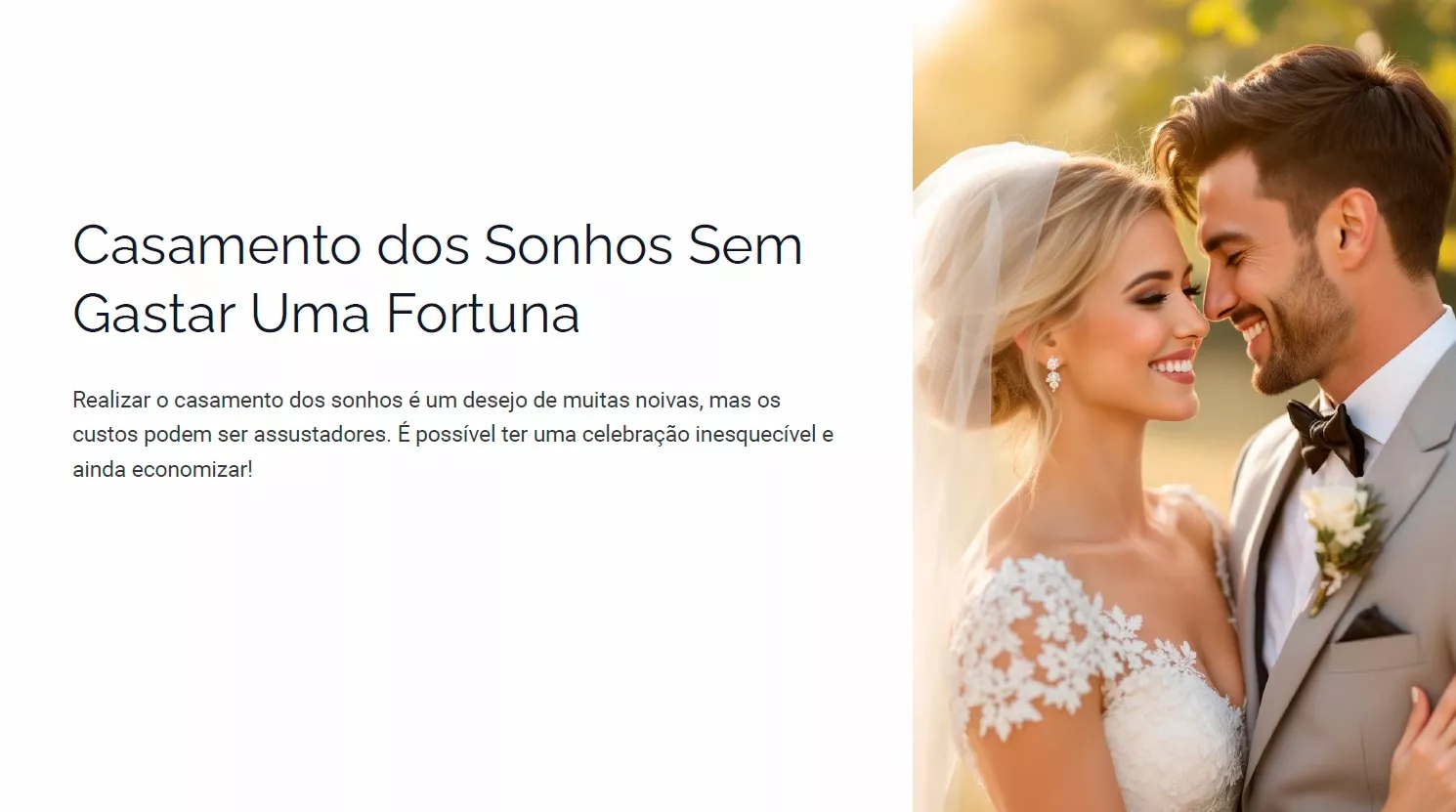Você sabia que é possível realizar uma festa inesquecível, elegante e cheia de estilo sem gastar rios de dinheiro? Com o eBook "Casamento dos Sonhos Sem Gastar Uma Fortuna" , você terá acesso a um guia completo e prático com ideias criativas, dicas valiosas e soluções reais para transformar seu grande dia em um evento único, econômico e adequado.